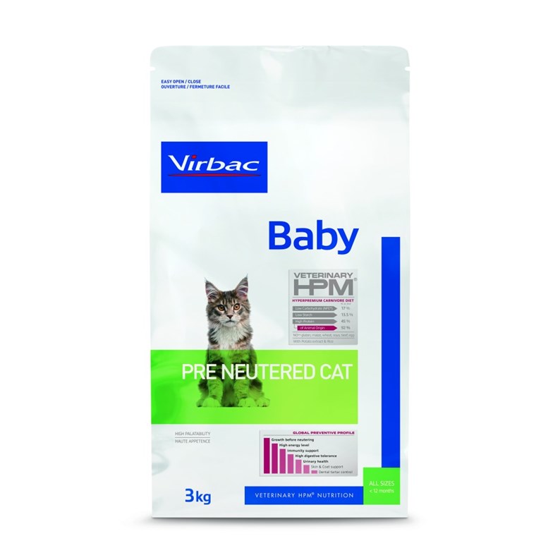 Les Croquettes chaton VIRBAC VETERINARY HPM CAT BABY PRE NEUTERED sont des croquettes complètes physiologiques pour chatons à partir du sevrage et jusquà 12 mois, ou avant sa stérilisation et chattes en gestation et lactation pour être au plus proche des besoins nutritionnels du chat