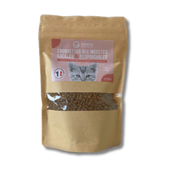Insecte de´shydrate´* (20%), ble´*, mai¨s*, protéine de pois* (12%), protéines de volaille déshydratées, graisse de volaille, son de ble´, carotte déshydratée (2%), phosphate monocalcique, hydrolysat de prote´ines animales, fibre de chicore´e (1,5%, dont inuline 0,9%), carbonate de calcium, levure de bière (1%), chlorure de potassium, ortie déshydratée* (0,2%), chlorure de sodium, algues déshydratées riches en DHA (0,14%), thym déshydraté* (0,1%).*matières premières origine Auvergne-Rhône-AlpesLa totalité des ingrédients est d’origine françaiseDiamètre des croquettes : 6 mmConstituants analytiques :CROQUETTES CHATON (et femelle allaitante) :Prote´ine brute 34,0 %Matie`res grasses brutes 16,0 %dont acide gras essentiel DHA 0,01 %Cellulose brute 3,0 %Cendres Brutes 7,5 %dont calcium 1,1 %dont phosphore 0,9 %Additifs nutritionnels :Vitamine A 22 828,9 UI/kgVitamine D3 1 532,9 UI/kgVitamine E 410,6 mg/kgVitamine B1 8,4 mg/kgVitamine B12 51,3 mg/kgVitamine B2 9,2 mg/kgVitamine B3 48,7 mg/kgVitamine B4 2 207,0 mg/kgVitamine B5 21,6 mg/kgVitamine B6 3,8 mg/kgVitamine B8 0,1 mg/kgVitamine B9 1,1 mg/kgTaurine 960,0 mg/kgCuivre 8,4 mg/kgFer 103,0 mg/kgIode 1 ,7 mg/kgManganèse 7,7 mg/kgZinc 96,6 mg/kgSélénium 0,4 mg/kg