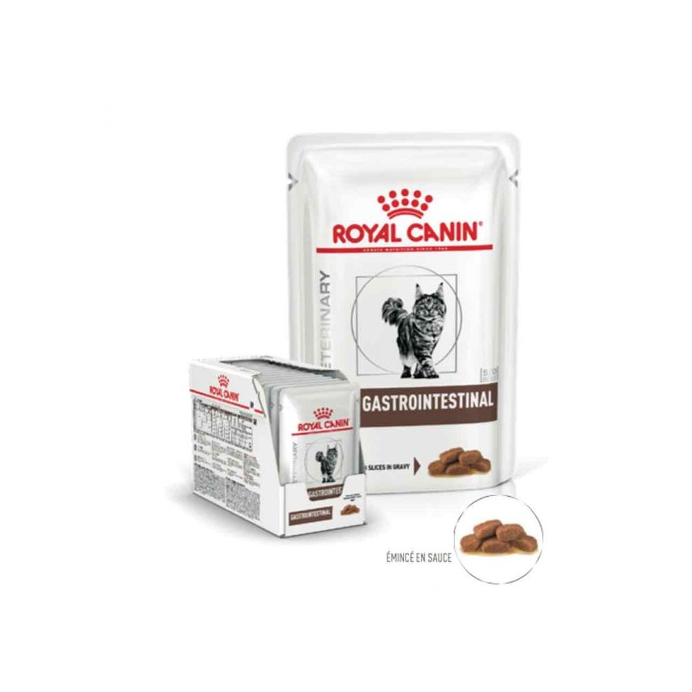 Les pâtées chat ROYAL CANIN VETERINARY CAT GASTROINTESTINAL sont des pâtées complètes pour les chats destinées à favoriser la réduction du risque de malabsorption intestinale aiguë, la récupération nutritionnelle et la convalescence. Elles sont composées d'ingrédients très digestes. Elles ont une teneur accrue en électrolytes et teneur élevée en nutriments essentiels. Leur densité énergétique est élevée. Il est recommandé de demander l'avis dun vétérinaire avant de les donner à votre chat. Utiliser VETERINARY CAT GASTROINTESTINAL émincé en sauce pendant une durée dune à deux semaines en cas de diarrhée aiguë, pendant la période de rétablissement qui sensuit et jusquà récupération complète.
