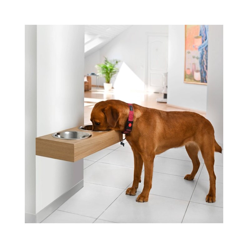 En voilà une gamelle pour chien design qui s'intègre parfaitement dans un intérieur ! Avec son très joli support mural en bois recouvert d'un placage en chêne, cette mangeoire a tout pour plaire. Très facile à installer, il vous suffira de 2 trous et quelques minutes pour fixer le support à votre mur, à la bonne hauteur pour votre chien. Une fois fixé, l'ensemble comprenant le support bois et les deux bols se 'glisse' facilement. Cela permet un nettoyage régulier et facile des bols mais aussi du support bois qui a été recouvert préalablement d'un vernis solide et écologique à base d'eau, qui le rend parfaitement hydrofuge. A noter que les deux bols en acier inoxydable ont amovibles et passent au lave-vaisselle.