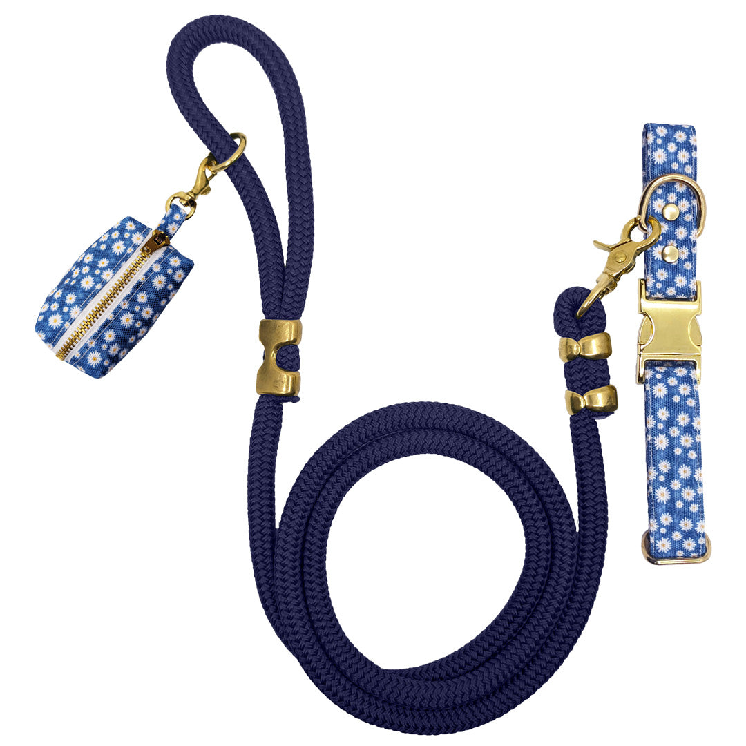 Découvrez notre Kit d'accessoires pour chien Le Marguerite en taille S avec sa laisse bleu foncé.