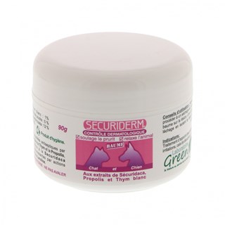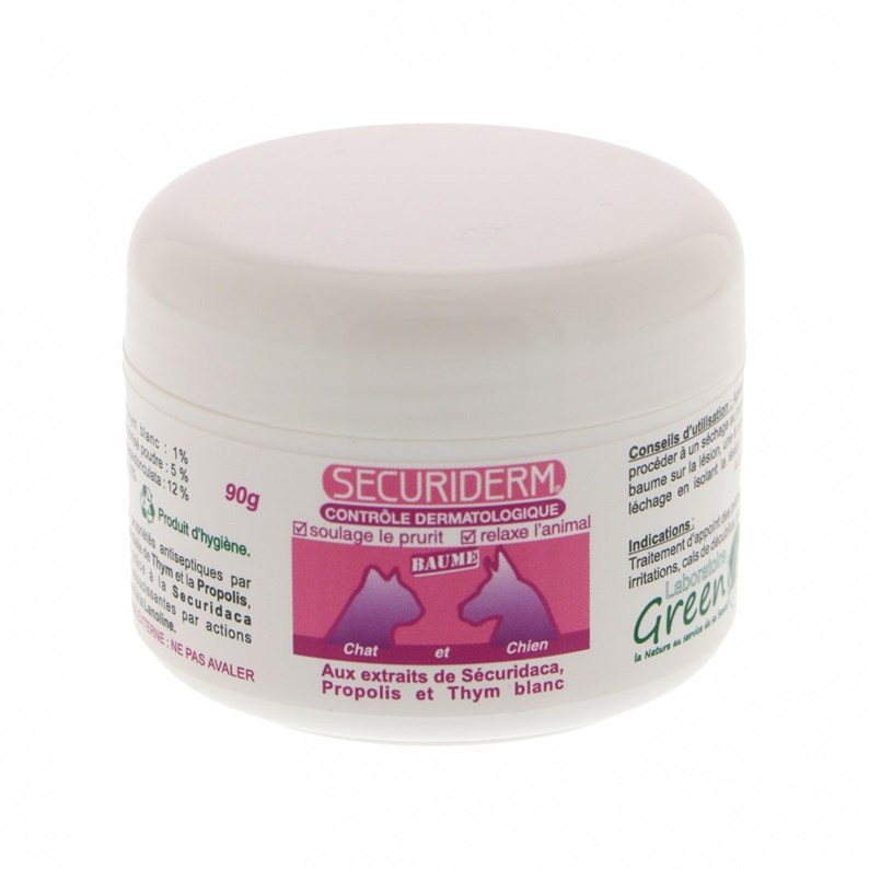 Le laboratoire Greenvet vous propose le baume Securiderm, il est conseillé dans le traitement des petites lésions cutanées du chien ou du chat : plaies de léchage, irritations, cals, escarres, crevasses des coussinets... Il soulage les démangeaisons de la peau et relaxe l'animal.