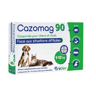 Cazomag 90 mg est un complément alimentaire conçu pour apaiser les chiens et chats de moins de 12 kg confrontés à des situations stressantes (voyages, bruits, déménagements...). Il favorise la sérénité émotionnelle sans somnolence.