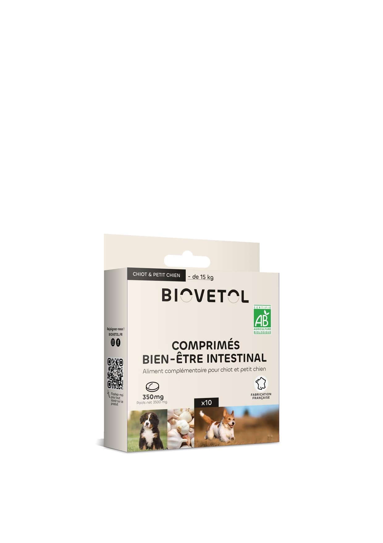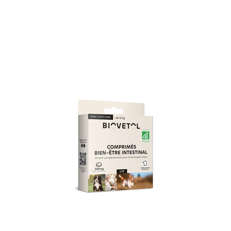 Ingrédients : Maltodextrine bio*, Gomme arabique bio* (Acacia senegal L., gum) 34,57%, Ail bio* (Allivum sativum L., bulbe) 8,57%, Extrait sec de pépin de courge bio* (Cucurbita pepo L., graine) 1,43%, Extrait sec d’écorce de Cannelle bio* (Cinnamomum cassia Bl., écorce) 1,43 %, Extrait sec de thym bio* (Thymus Vulgaris L., feuilles) 0,24%Valeurs alimentaires par comprimé de 350 mg : Valeurs alimentaires par comprimé 350 mg : Protéines brutes 0,008 g, Fibres alimentaires brutes 0,266 g, Matières Grasses brutes 0,0009 g, glucides 0,034 g, cendre brutes 0,022 g, Calcium 1,40 mg, Sodium 1,19 mg, Phosphore 1,18 mg.100 % des matières premières d’origine agricole sont issues de l’agriculture biologique*. Conforme au Cahier des charges Aliments pour animaux de compagnie - homologué le 16/02/2004. Certifié FR-BIO-01