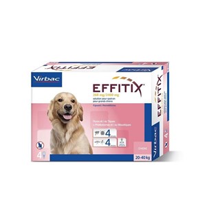 EFFITIX CHIEN (20-40 KG) - VIRBAC est un antiparasitaires pour chien de 20 à 40 kg pour lutter contre les infestations par les puces et/ou les tiques. EFFITIX CHIEN a une action répulsive contre les phlébotomes et/ou les moustiques.