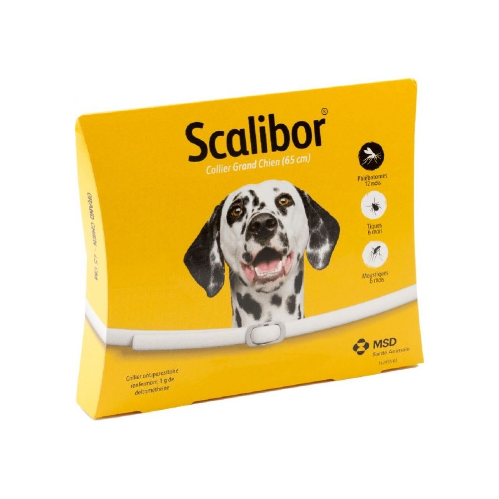 <p>• SCALIBOR® Collier Grand Chien :</p><p>DELTAMETHRINE : 1 g</p><p>Savon organo-métallique Ca-Zn</p><p>Huile de soja époxydée</p><p>Diisooctyladipate</p><p>Triphénylphosphate</p><p>Colorant QS couleur*</p><p>Chlorure de polyvinyle</p><p>* Collier blanc</p><p>Oxyde de titane (E 171)</p><p>* Collier marron</p><p>Oxyde de fer noir (E 172)</p><p>Oxyde de fer jaune (E 172)</p><p>Oxyde de fer rouge (E 172)</p><p>* Collier noir</p><p>Oxyde de fer noir (E 172)</p><p>Excipient q.s.p. : 25 g</p><p><br /><br /></p><p>Indication</p><p>Chez les chiens, affections à parasites sensibles à la deltaméthrine :</p><p></p><p>- Effet acaricide contre les tiques (Ixodes ricinus; Rhipicephalus sanguineus) persistant pendant 6 mois.</p><p>- Effet répulsif (antigorgement) contre les phlébotomes (Phlebotomus perniciosus) persistant pendant 12 mois.</p><p>- Effet répulsif (antigorgement) contre les moustiques (Culex pipiens pipiens) persistant pendant 6 mois.</p>