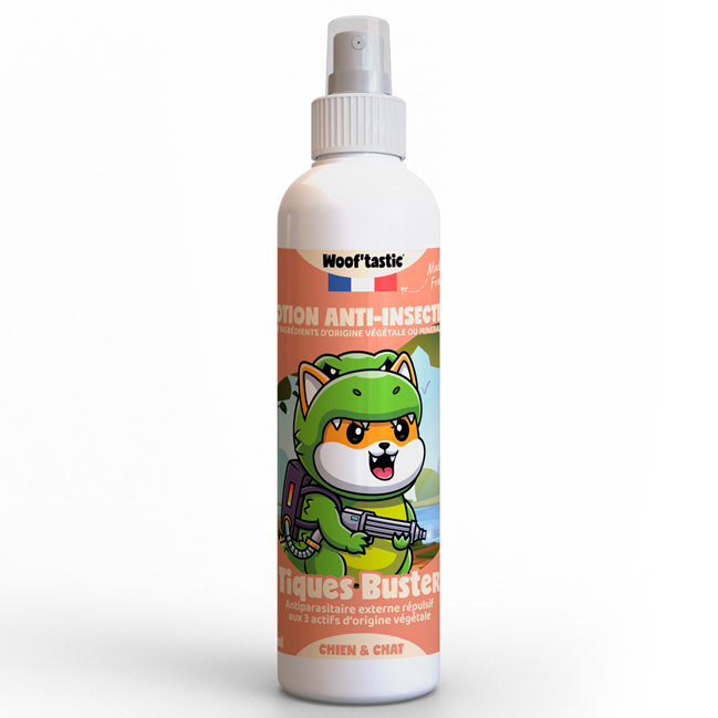 Protégez votre compagnon des tiques, puces et moustiques avec Tiques Buster, un spray aux actifs végétaux.