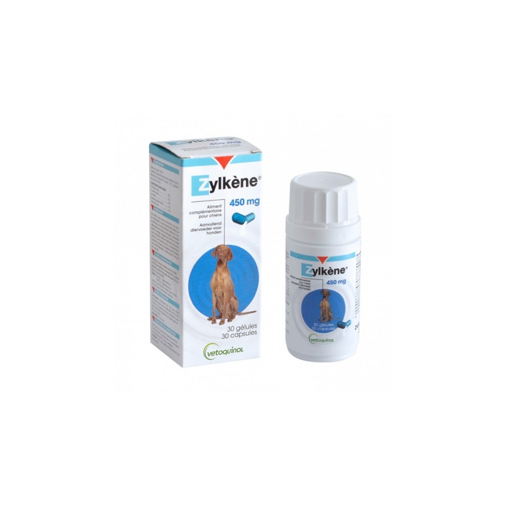 ZYLKENE 450 MG (20-40 KG) - VETOQUINOL est un supplément alimentaire sous forme de gélule pour chien de 20 à 40 kg pour faire face à une situation stressante ponctuelle ( Feu d'artifice, visite chez le vétérinaire, trajets en véhicule) ou une situation stressante qui implique un changement durable de son environnement (déménagement, arrivé d'un nouveau né, adoption d'un nouvel animal)