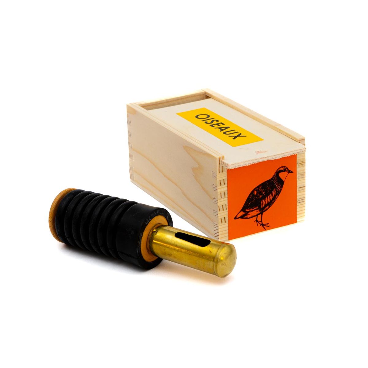 L'appeau est livré dans un coffret en bois, illustré avec une image de l'oiseau. Cet appeau s'utilise de la manière ""manuelle"".