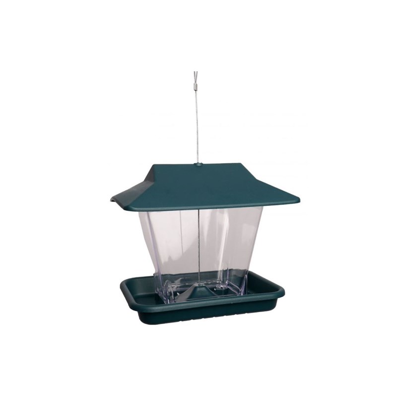Mangeoire à oiseaux en plastique vert et transparent, durable et résistante aux intempéries.  En savoir plus