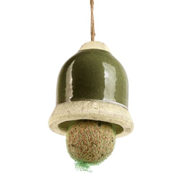 - La mangeoire cloche est fabriquée en argile et peinte pour s'intégrer dans le feuillage des arbres.