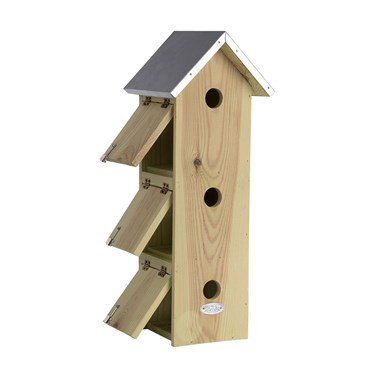 Elle se décompose en trois étages équipés chacun d'un trou en façade de 32 mm, d'une trappe latérale, fermée par un crochet, permettant un accès facile pour le nettoyage annuel. Son toit en zinc est fixe, elle trouvera sa place sur une terrasse, un balcon ou sous un toit.