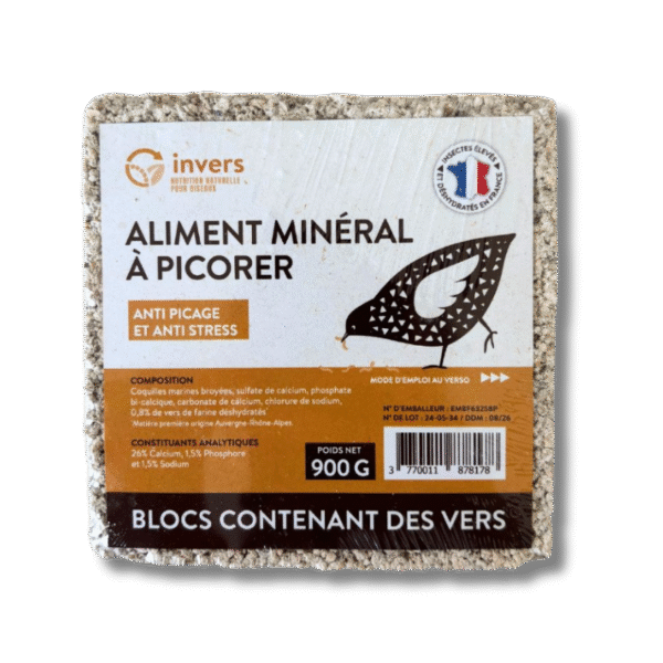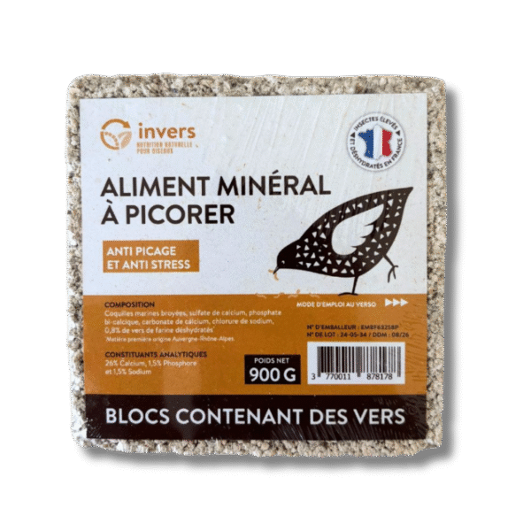 Coquilles marines broyées, sulfate de calcium, phosphate bi-calcique, carbonate de calcium, chlorure de sodium et vers de farine déshydratés.Constituants analytiques :Calcium : 28 %Sodium : 2,5 %Phosphore : 2,5 %