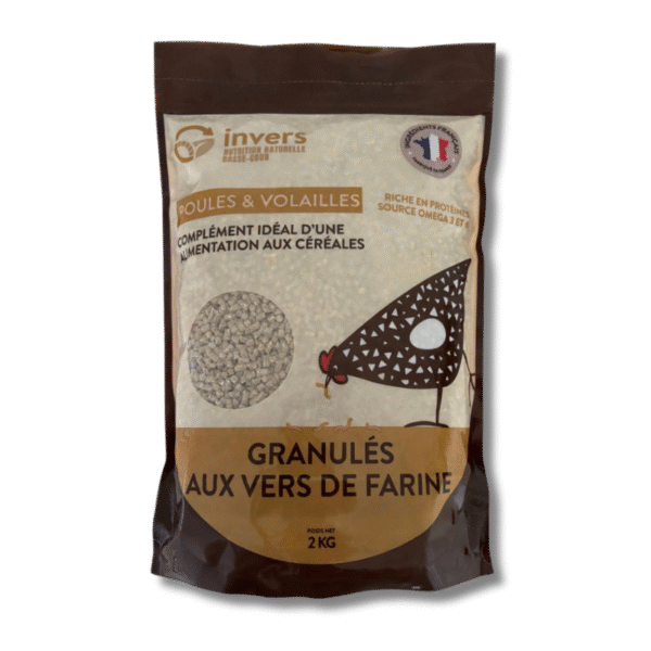 Composé de vers de farine déshydratés, céréales et légumineuses, cet aliment est à donner en complément de la ration journalière,