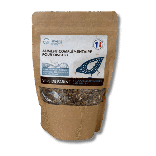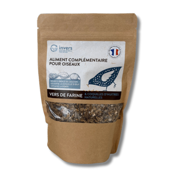 Composé de 92% de coquilles d’huîtres et 8% de vers de farine déshydratés (larves de Ténébrion meunier).