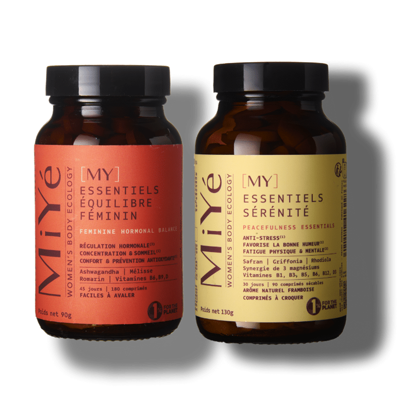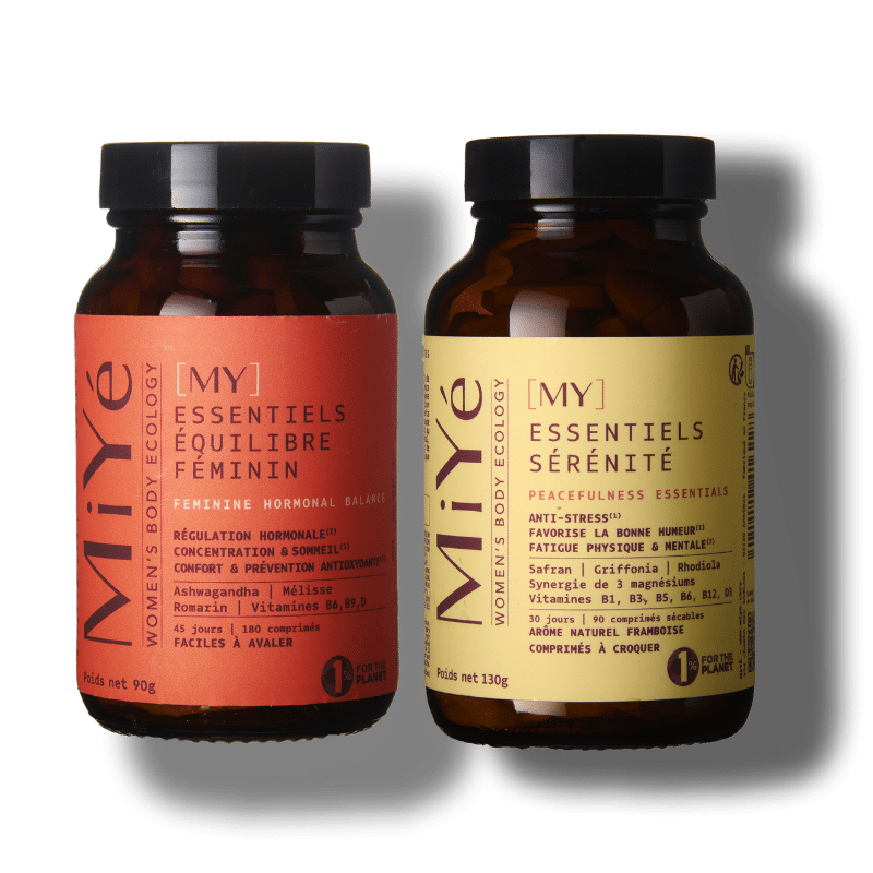 [MY] ESSENTIELS ÉQUILIBRE FÉMININ INGRÉDIENTS (4 comprimés) : GOMME D’ACACIA*, EXTRAIT DE ROMARIN* 500 MG (2000 MG EQPS**), EXTRAIT DE MÉLISSE* (400 MG EQPS), AGENT DE CHARGE : MAGNESIUM CARBONATE, EXTRAIT D’ASHWAGANDHA* DOSÉ À 5% DE WHITANOLIDES 60 MG (600 MG EQPS**), HUILE DE TOURNESOL*, VITAMINE B6 1,4 MG (100% DES VNR***), VITAMINE B9 200 µG (100% DES VNR***),VITAMINE D3 5 µG (100% DES VNR***). *Ingrédients BIO. 99.73% du total des ingrédients est BIO. ** Equivalent Plantes Sèches. ***Valeurs nutritionnelles de référence. [MY] ESSENTIELS SÉRÉNITÉ INGRÉDIENTS (3 comprimés sécables) : SORBITOL, SELS DE MAGNESIUM DE L’ACIDE CITRIQUE 1004 MG (30% DES VNR**), MALATE DE MAGNESIUM 664 MG (20% DES VNR**), INULINE, AGENT DE CHARGE : TRICALCIUM PHOSPHATE, BISGLYCINATE DE MAGNESIUM 187,5 MG (10% DES VNR**), HUILE DE TOURNESOL, AROME NATUREL DE FRAMBOISE, ACIDIFIANT : ACIDE CITRIQUE, EXTRAIT SEC DE GRIFFONIA (DONT 30% 5-HTP) 100 MG EQPS*, EXTRAIT SEC DE RHODIOLE (DONT 1% DE SALIDROSIDES) 30 MG EQPS*, EXTRAIT DE SAFRAN (DONT 0,3% SAFRANAL) 30 MG EQPS*, VITAMINE B3 8 MG (50% DES VNR**), VITAMINE B5 6 MG (100% DES VNR**), VITAMINE B6 P5P 1,4 MG (100% DES VNR**), VITAMINE D3 5 µG (100% DES VNR**), VITAMINE B1 0,55 MG (50% DES VNR**), VITAMINE B12 1,25 µG (50% DES VNR**). * Équivalent Plantes Sèches. **Valeurs nutritionnelles de référence