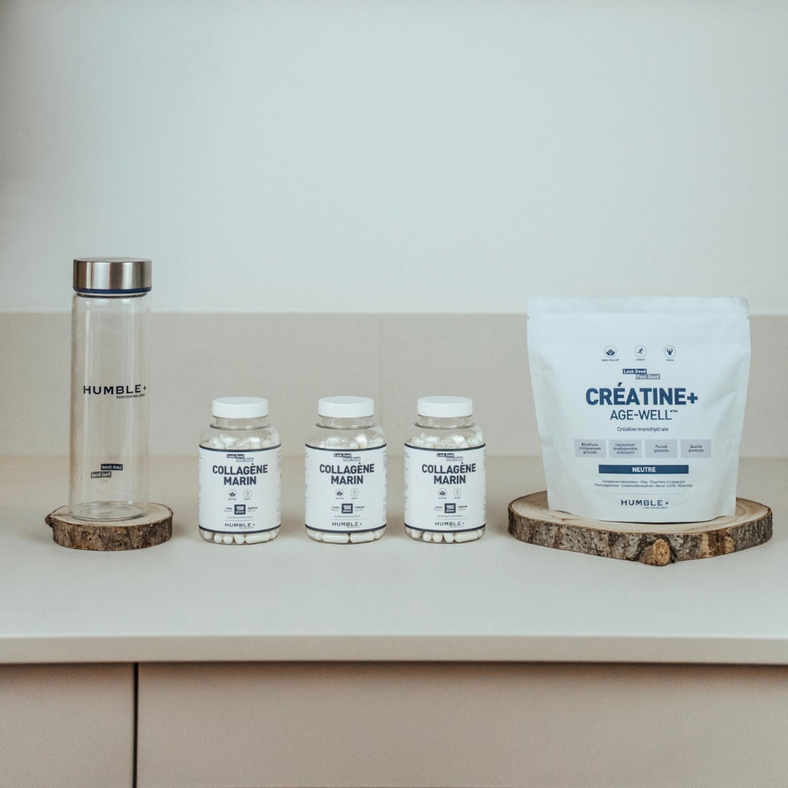 Un duo associant collagène en gélules et créatine pour atténuer les effets de la ménopause (fatigue, perte de tonus, peau moins ferme) tout en soutenant la force, la vitalité et l’équilibre hormonal.