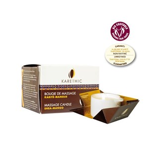 Cette bougie de massage de la marque Karethic est fabriquée majoritairement à base de beurre de karité non raffiné, un ingrédient 100% naturel. Elle ne contient pas de PEG, de silicone, d'OGM, de paraben, de colorant artificiel, d'ingrédients issus de la pétrochimie ou de matière première d'origine animale.