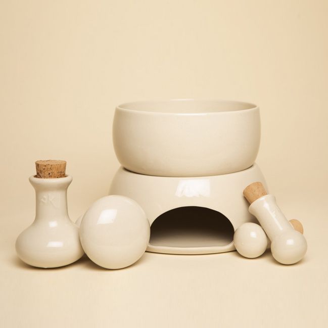 Contient : 1 paire d'éléments Satinka, 1 paire d'éléments Ishka, 1 chauffe-bougie, 3 bougies, 1 contenant, 2 bouchons de rechange et 1 serviette Akwaterra.