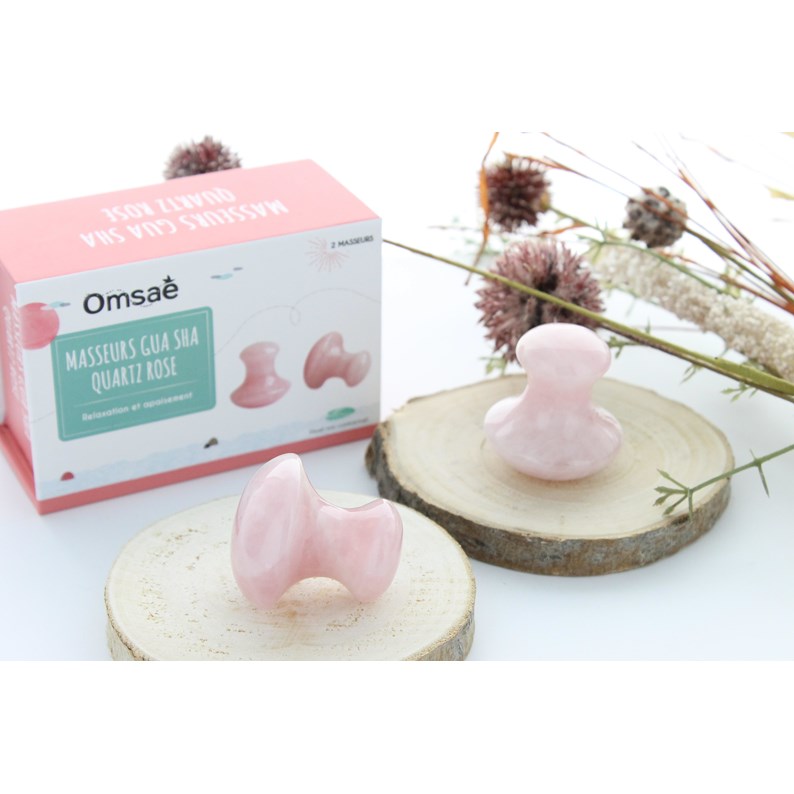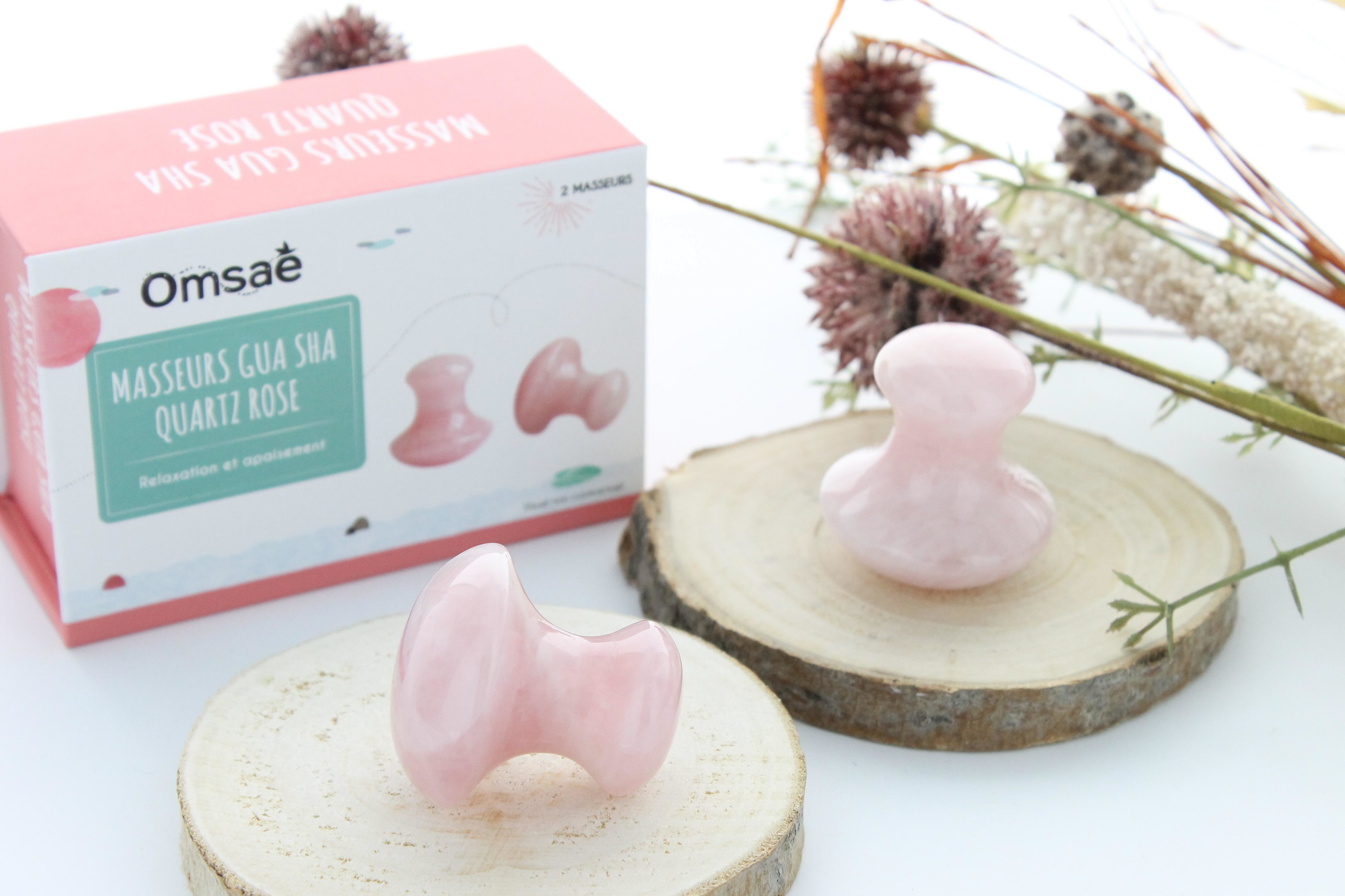 Coffret masseurs visage gua sha Omsaé en quartz rose, relaxation et apaisement