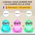 Les couleurs changent au rythme de votre souffle : bleu pour inspirer, violet pour retenir, vert pour expirer. Vous pouvez suivre la lumière les yeux ouverts, ou fermer les yeux en vous laissant guider par la voix. Le mode silencieux permet une expérience plus discrète.