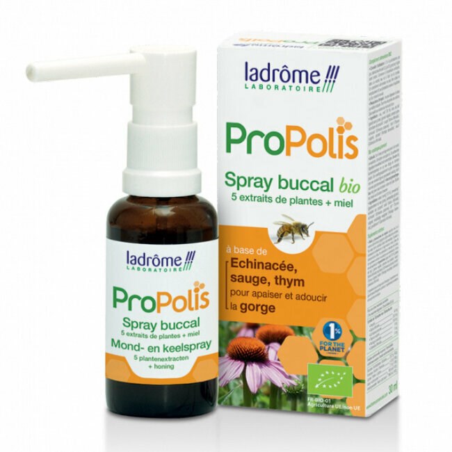 Le spray buccal à la propolis bio de Ladrôme a été conçu pour apaiser et désinfecter la gorge.