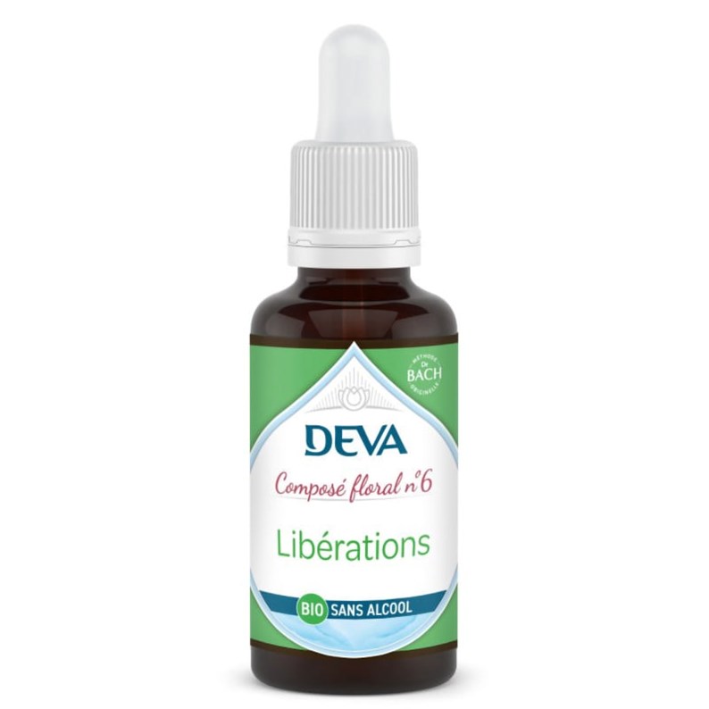 Le composé floral Libérations n°6 du Laboratoire DEVA est un élixir floral biologique dédié à l'équilibre émotionnel. Reconnu pour accompagner changement d'habitude, il est fabriqué à la main dans le Vercors selon la méthode originelle du Dr Bach et certifié bio par Ecocert FR-BIO-01.