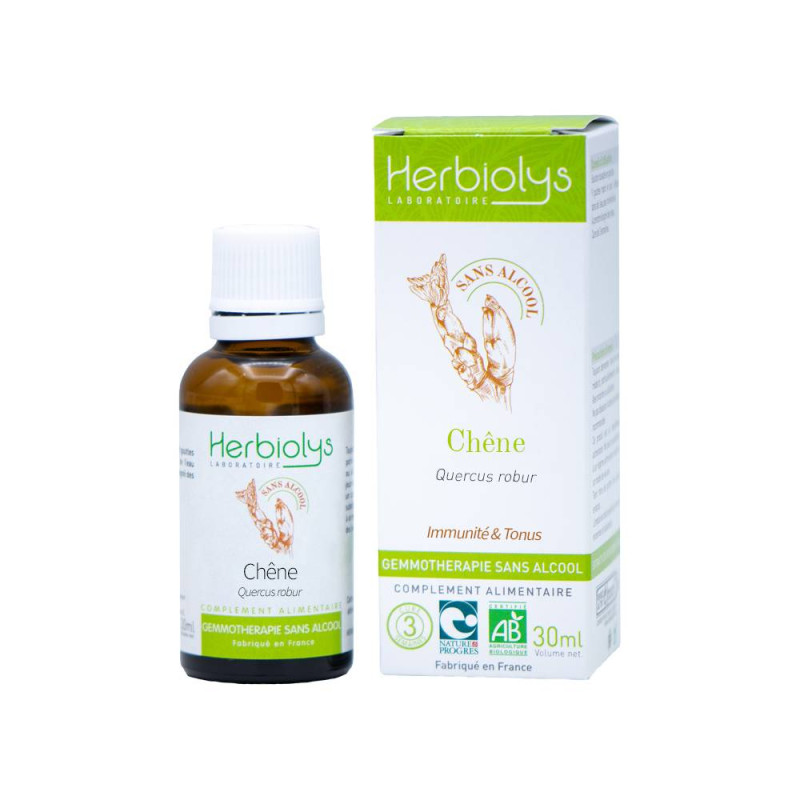 Bourgeon frais de feuille frais de Chêne pédonculé bio (Quercus robur / pedunculata) 43 mg Additifs : Glycérine végétale bio, eau de source peu minéralisé.
