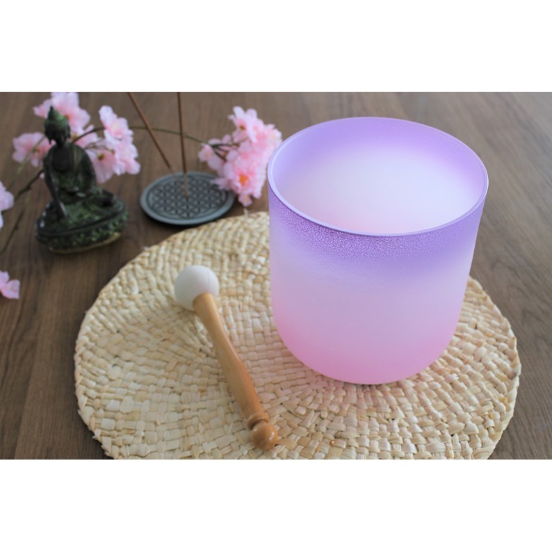 Objet étonnant par l'ambiance sonore qu'il produit, le son doux et profond de ce bol chantant en cristal permet de faire du bien au coeur, au corps et à l’esprit lors des séances de méditation. Les vibrations qu'il libère rééquilibrent les fréquences de chacun et favorisent la détente. Avec sa composition en cristal de quartz, ou sable de silice, il suffit de faire chanter le bol pour que le silicium et l'oxygène qui se trouvent en chacun de nous résonnent. Une connexion immédiate avec le corps se crée grâce aux notes pures et cristallines. Élégamment coloré de rose et de violet, il rééquilibrera les chakras couronne et troisième oeil, et saura séduire par son esthétisme.
