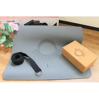 Tapis de yoga gris avec motif bien-être composé de 30% de TPE écologique et de 70% d'EVA. Épaisseur : 6 mm. Dimensions : 183 x 61 cm. Poids : env. 1060 g. Brique de yoga avec motif bien-être composée de 100% de liège écologique non toxique. Dimensions : 7,6 x 15,2 x 22,9 cm. Poids : env. 700 g. Sangle de yoga noire composée de 80% de coton et de 20% de polyester avec une boucle en métal. Dimensions : 200 x 3,8 cm. Poids : env. 110 g.