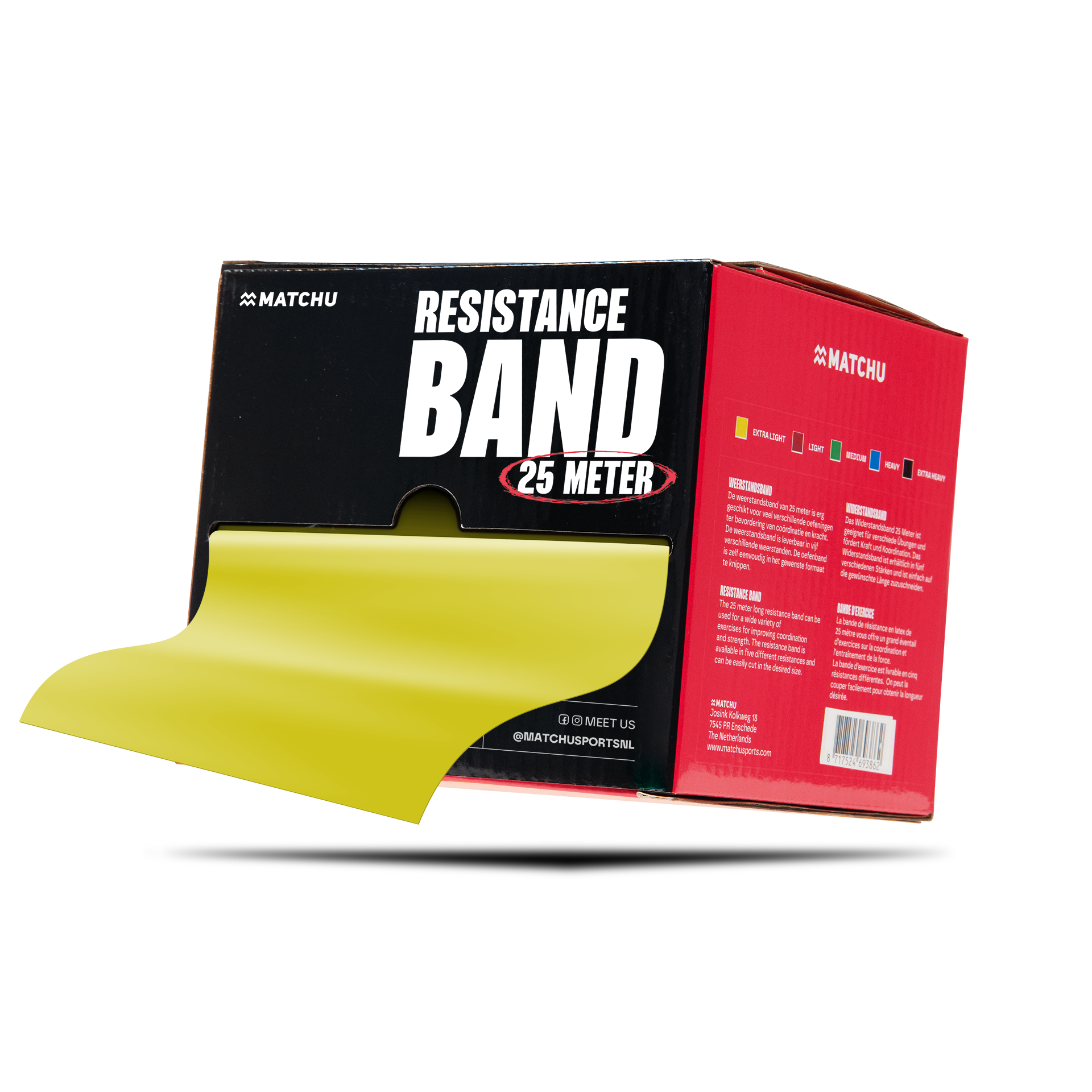 Cette bande de resistance de 25 metres est parfaite pour toutes sortes de programmes d'entrainement afin de promouvoir la coordination et la force. La bande de resistance de 25 metres est egalement souvent utilisee comme substitut aux poids. La bande peut meme etre coupee a la taille souhaitee. La bande de resistance est disponible en 5 resistances differentes.