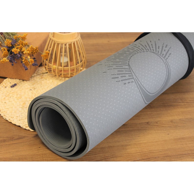Tapis de yoga composé de 30% de TPE écologique et de 70% EVA. Dimensions : 183 x 61 cm, épaisseur 6 mm. Sangle noire de transport fournie.