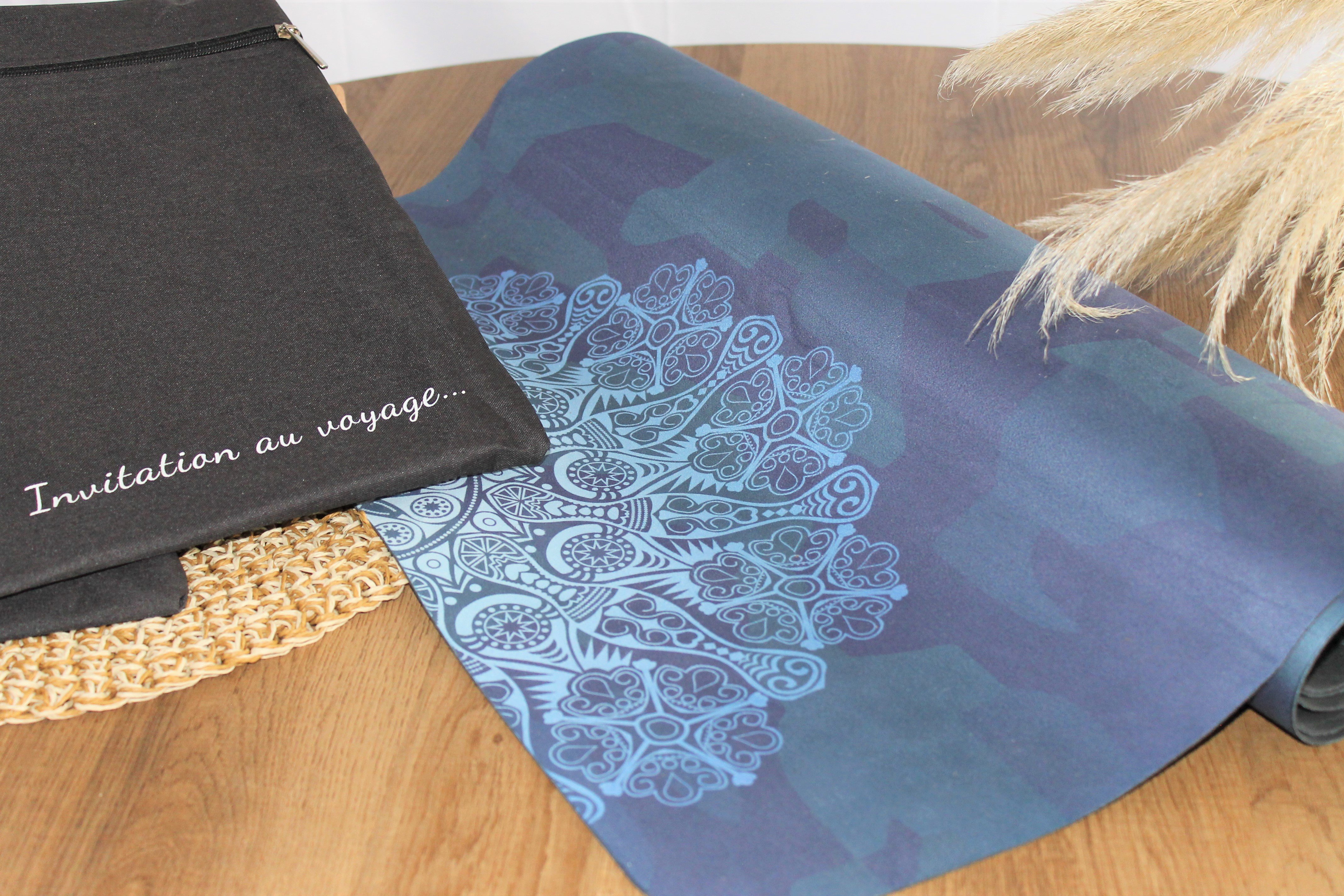 Tapis de yoga avec motif rosace composé de 50% de daim et de 50% de gomme écologique non toxique. Encres à l'eau. Dimensions du tapis : 183 x 61 cm, épaisseur 1,5 mm. Fournie avec une pochette de transport de couleur noire. Pochette composée de 100% de polyester et d'un zip en nylon. Dimensions de la pochette : 40 x 30 cm.