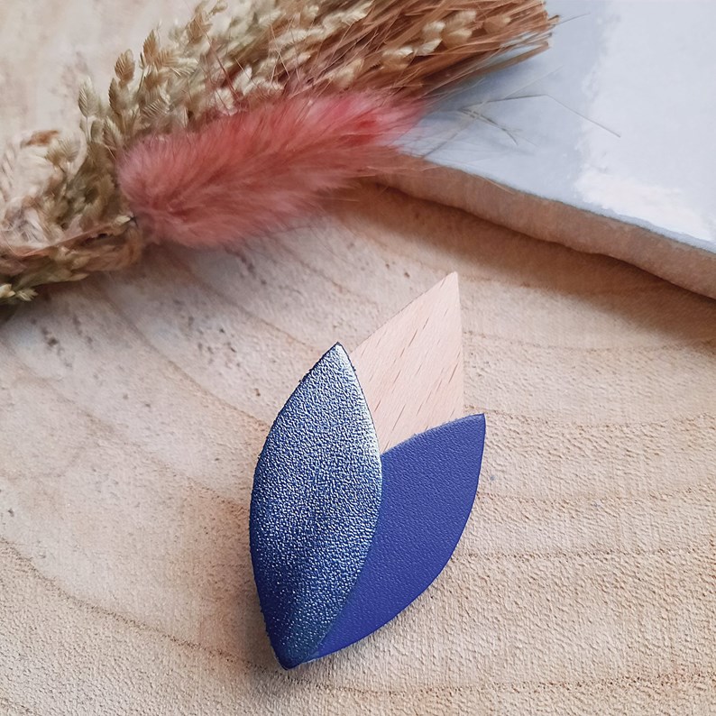 Broche en bois tulipe bleu klein