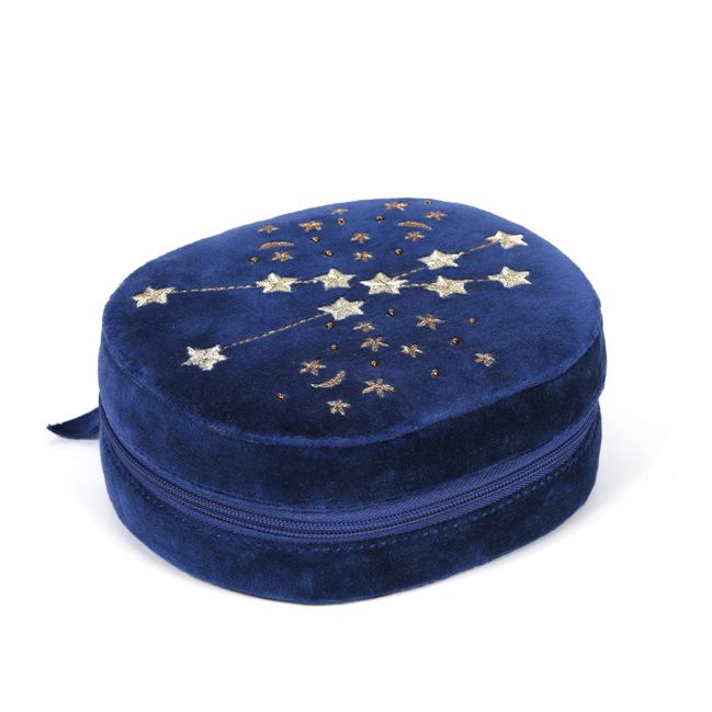 - Sur l'extérieur, admirez le tissu en velours bleu. Il dévoile de belles étoiles dorées, brodées à la machine par des artisans spécialisés en Inde.