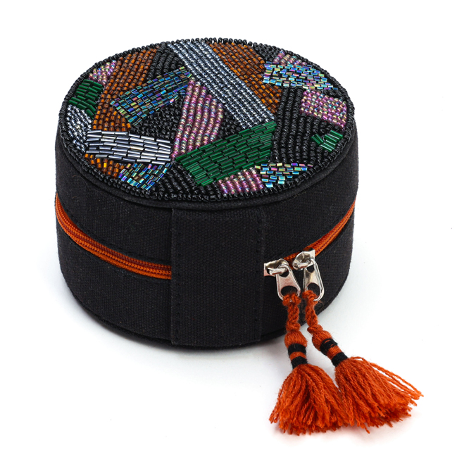 - Fermeture : un zip orné de pompons rouges garantit que vos bijoux restent bien à leur place.