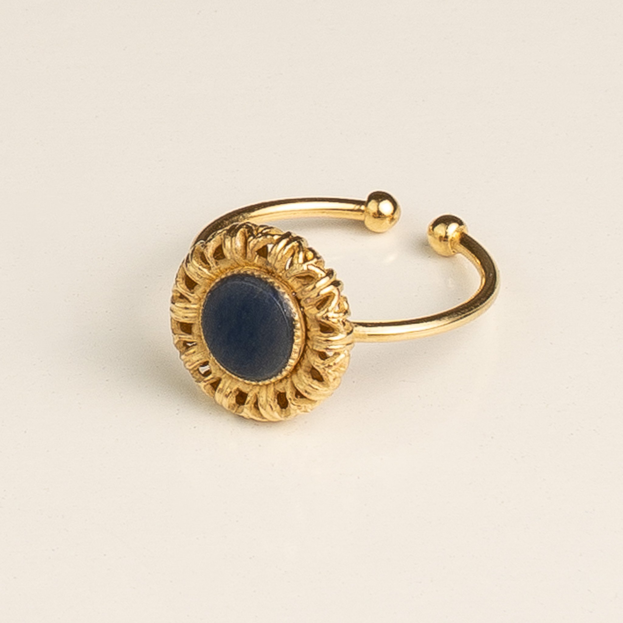Caractéristiques techniques : anneau ajustable (taille unique adaptable) ; matière : laiton plaqué or ; pierre principale : sodalite naturelle 6 mm ; style : bague fine. Garantie 1 an. Livrée dans un écrin marqué « L’Atelier du Marais – Paris », prêt à offrir.