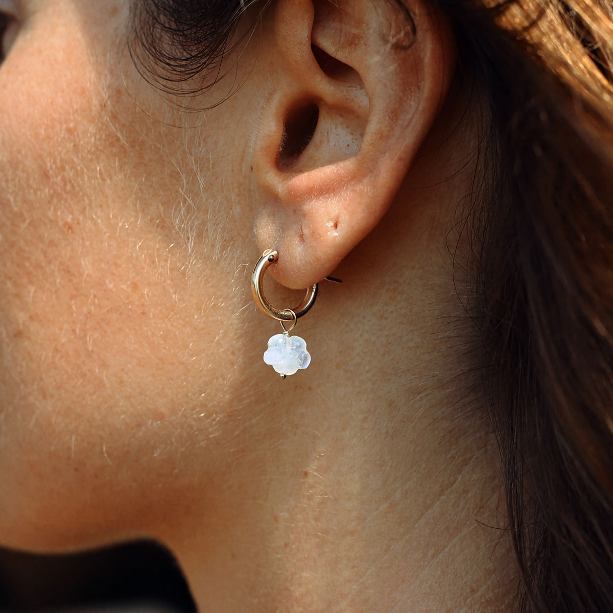 Inspirées de la nature qui nous entoure, les boucles « Nuage » mettent à l'honneur la pierre de lune arc-en-ciel. En lithothérapie, cette pierre serait reconnue pour ses vertus apaisantes, favorisant l'intuition et l'équilibre émotionnel. Ce bijou capture l'essence de cette gemme naturelle dans un design poétique et épuré.