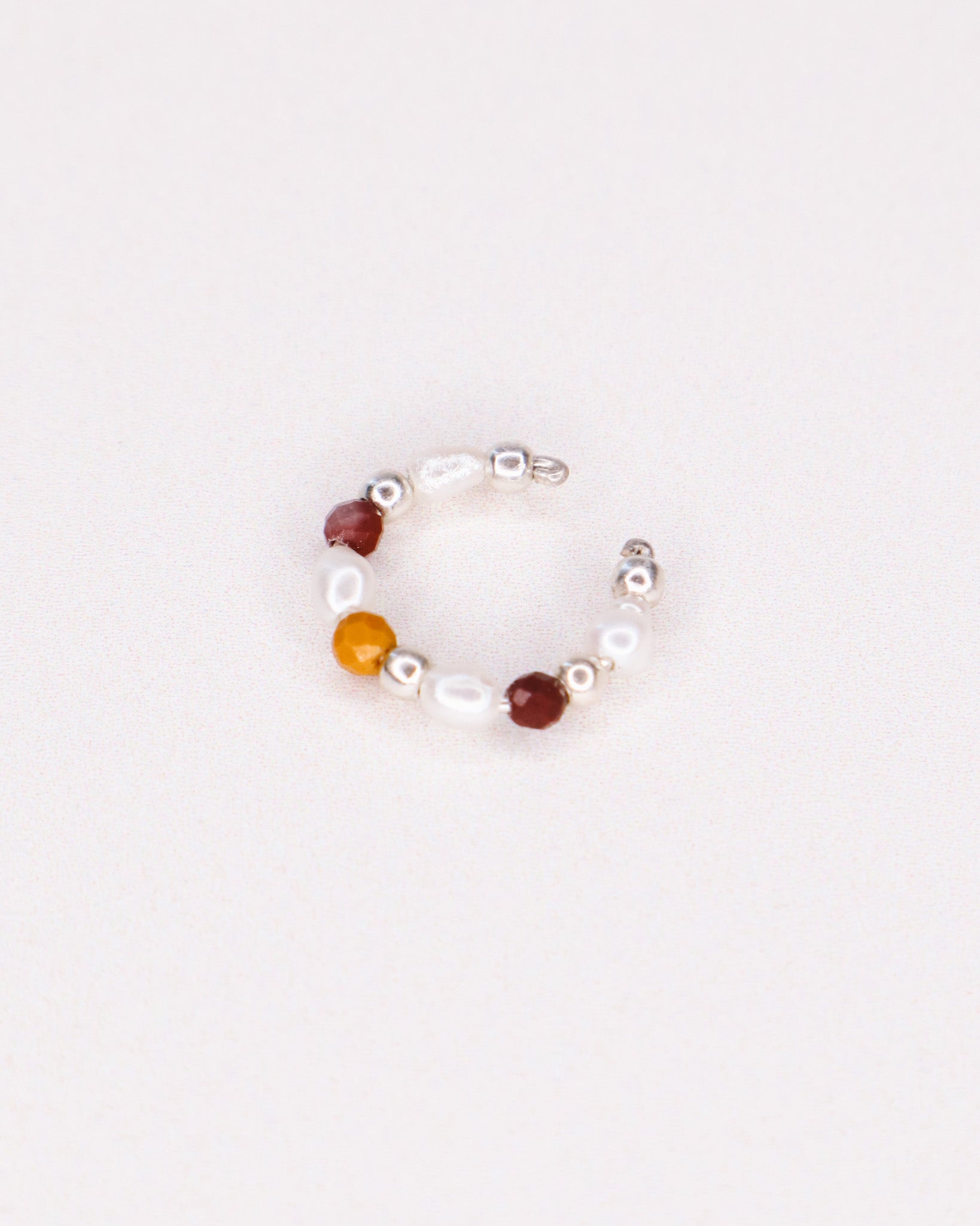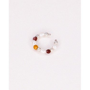 Ornée de perles de culture blanches et de pierres naturelles de jaspe mokaïte marron, rouge et jaune. Le faux piercing fait 1,3cm de diamètre et peut se placer à différents endroits de l'oreille