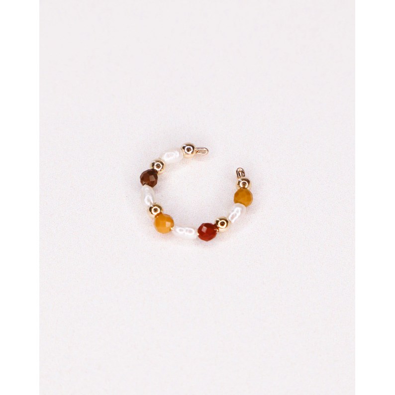 Ornée de perles de culture blanches et de pierres naturelles de jaspe mokaïte marron, rouge et jaune. Le faux piercing fait 1,3cm de diamètre et peut se placer à différents endroits de l'oreille