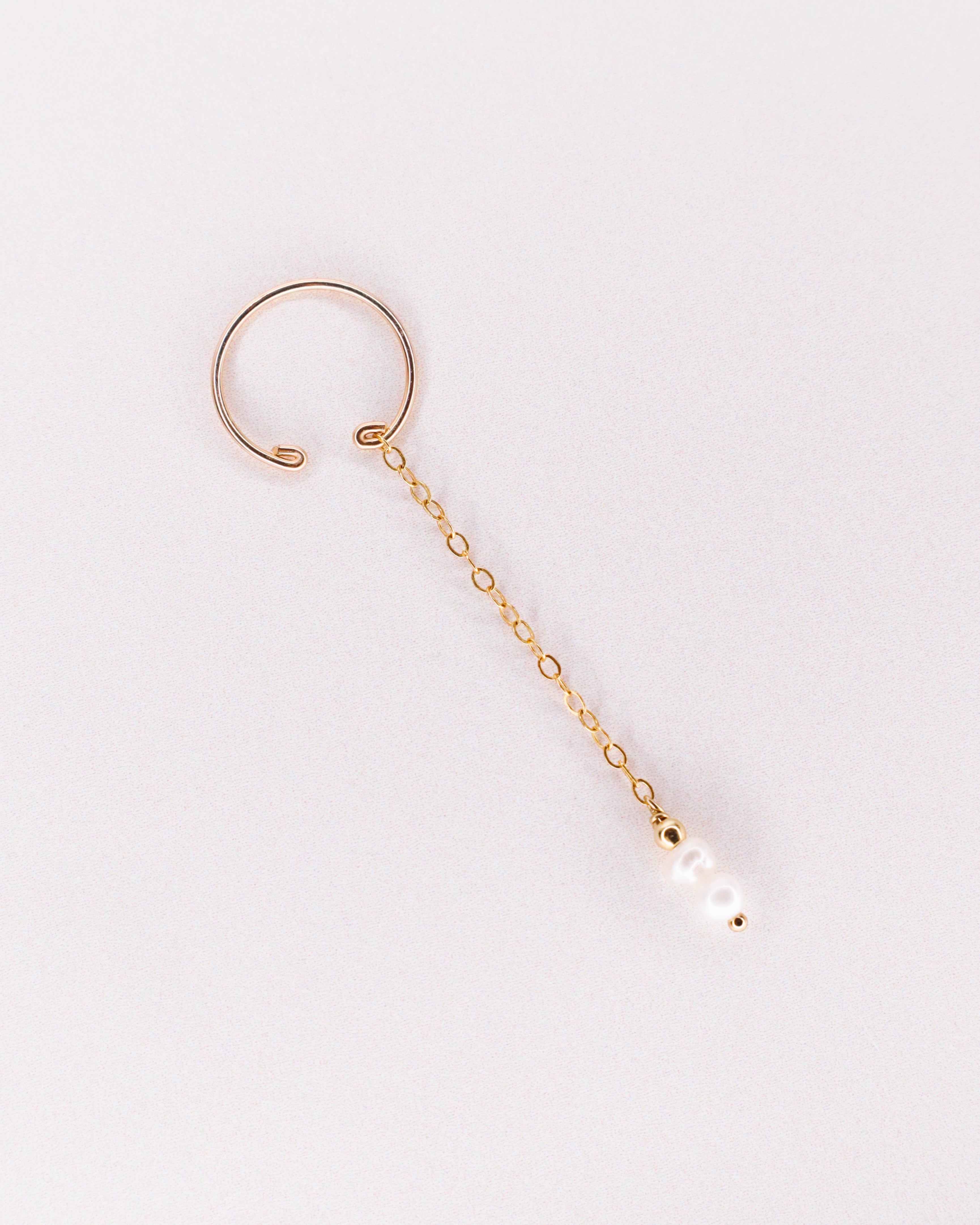 Ornée de perles de culture blanche, la chaine fait 4 centimètres de longueur, et le faux piercing fait 1,3cm de diamètre