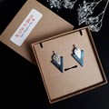 Les Clous d'oreilles TRIANGLE Bleu Pétrole mixent un duo de cuir (Bleu pétrole et argent pailletté).