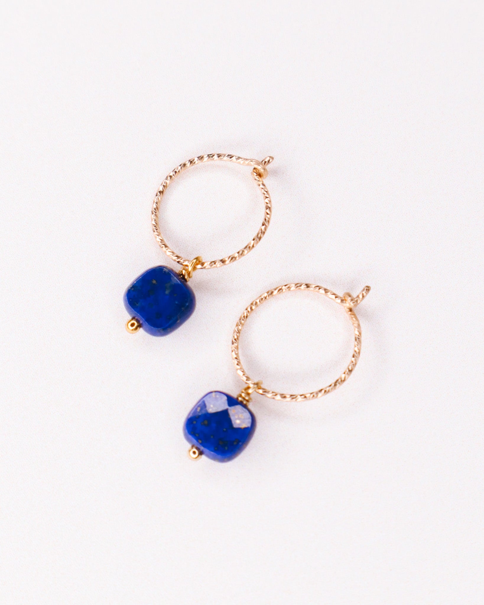 Ornées de pampilles de pierres naturelles de lapis lazuli bleu, les créoles font 1,3cm de diamètre.