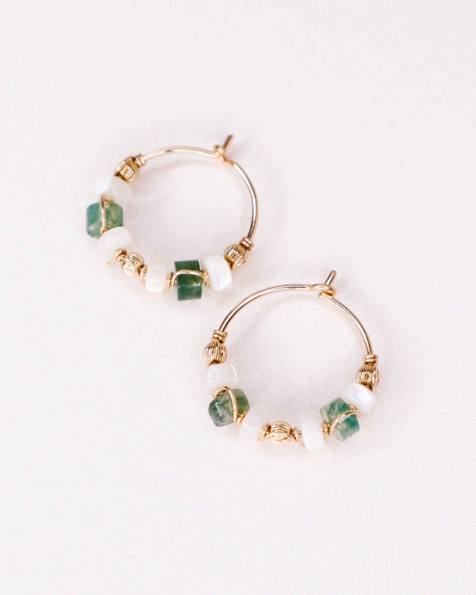 Ornées de pierres de nacre blanche et d'agate mousse verte, autour desquelles est tissé un fil d'or.