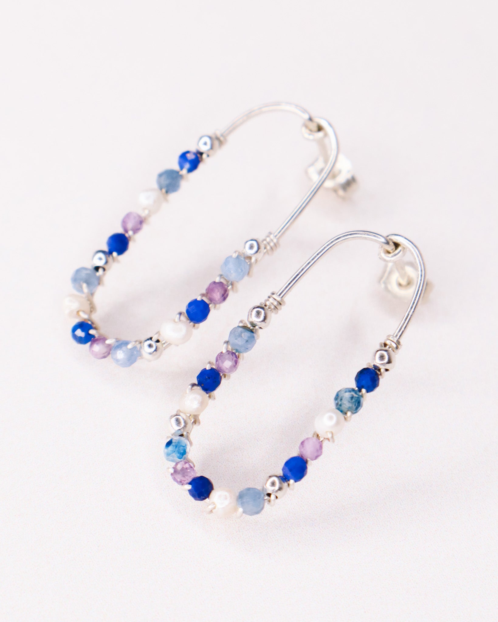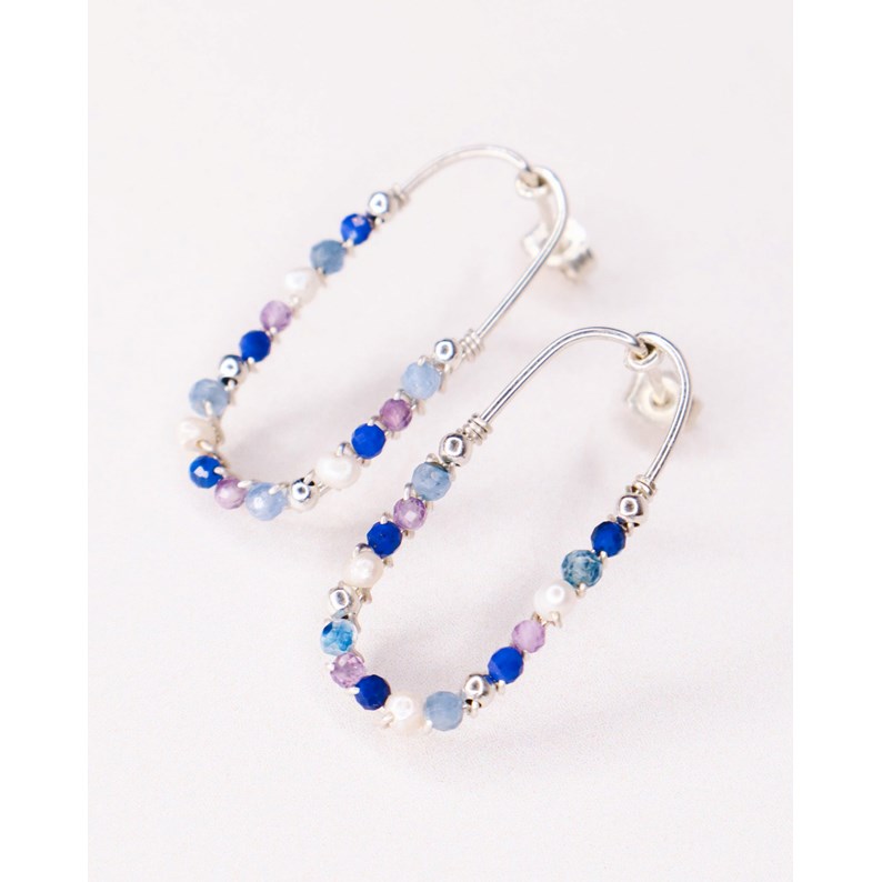 Ornées de pierres naturelles de lapis lazuli bleu foncé, de cyanite bleu, d'améthyste violette et de perle de culture blanche. Les boucles font 2,6cm de longueur.
