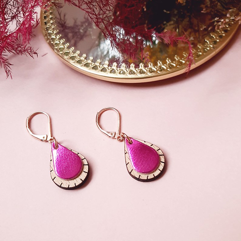 Le bois de hêtre s'accorde parfaitement à une gouttes de cuir rose fuchsia pour affirmer l'éclat de ce bijou résolument féminin.