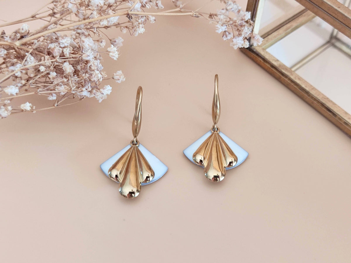 Découvrez ces boucles d'oreilles éventail vintage avec pendentif émaillé blanc et son pendentif gouttes en acier doré, esprit rétro chic garanti