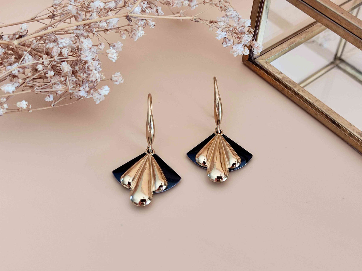 Découvrez ces boucles d'oreilles éventail vintage avec pendentif émaillé noir et son pendentif gouttes en acier doré, esprit rétro chic garanti