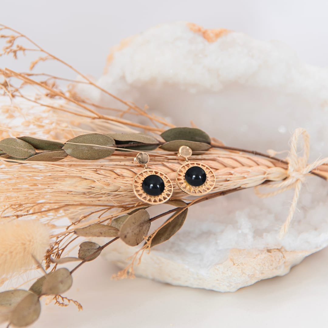 Boucles d’oreilles pendantes obsidienne leonie or
