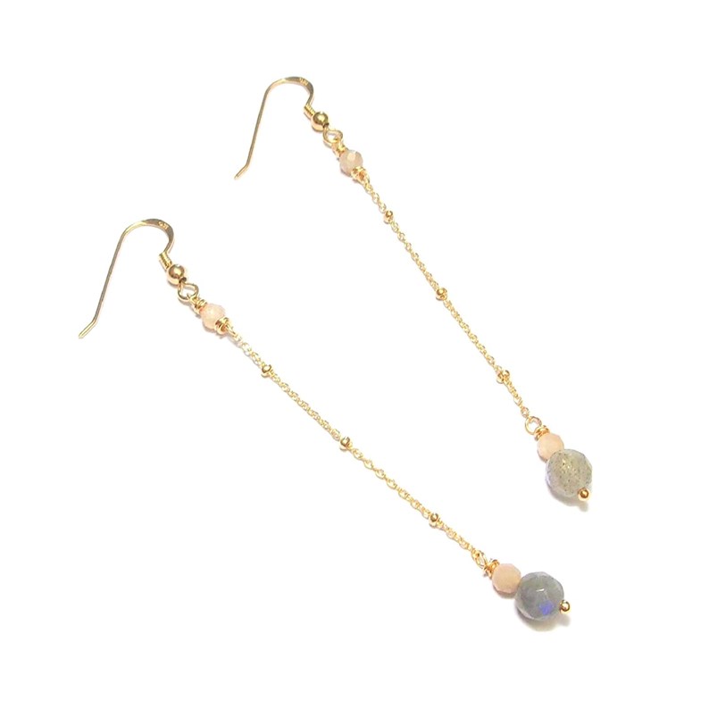 Boucles d'oreilles longues et délicates en argent doré et pierres fines: labradorite et pierre de lune.